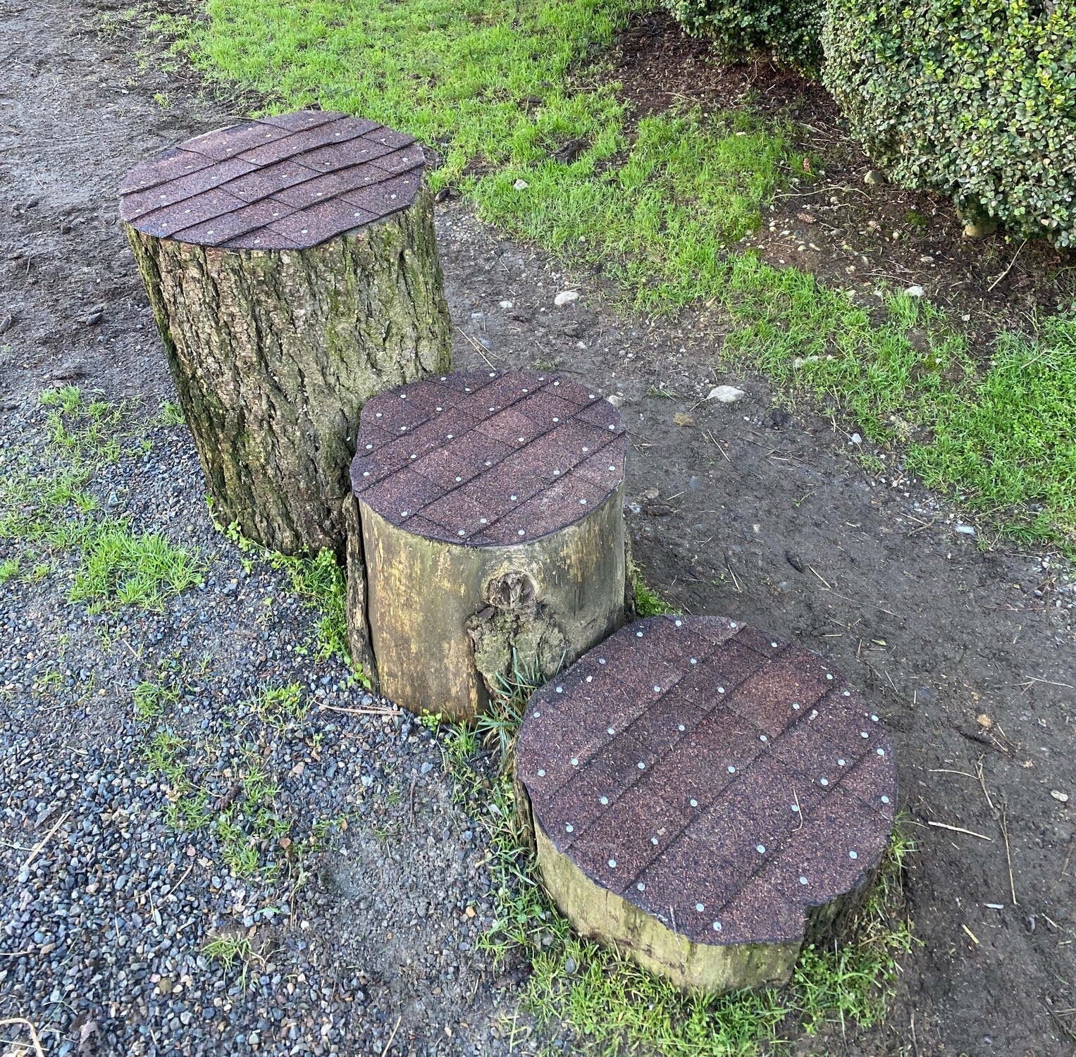 The shingles and roofing nails can be picked up from your local hardware store for a reasonable price, and certainly less costly than an injury or insurance deductible. With a good pair of shears, shingles can be cut to match the unique shape of each stump and add some character to the blocks. The project pictured above took about an hour to trace, cut, and apply.